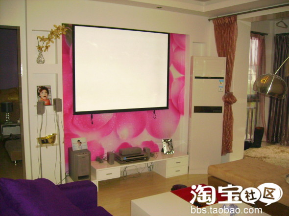 墙上已预留电视机的壁挂位置,现在我们用电动投影幕布,老公要看世界杯所用的。巧妙的隐藏在背景墙上方。
