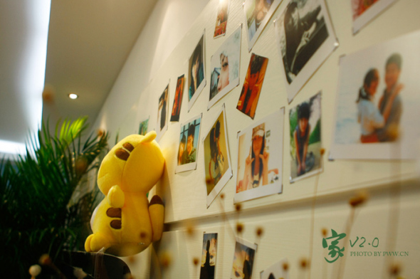 进门的地方原来整面墙壁太单调,并且人进进出出的,很容易脏掉,所以做了一面木板墙,上面放了一些照片和实用的小东西,比如那个吊勾,进出时可以挂钥匙,这样不会老找不到放哪了。