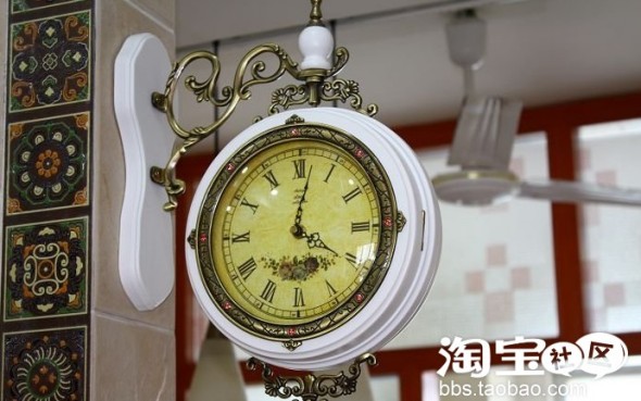 欧式田园风格两面钟,一面罗马数字,一面阿拉伯数字,这款钟我越用越喜欢,挂在玄关墙侧面,每天在厨房做饭,一扭头,就能看到时间,想想淘宝那掌柜说得也很在理,一个家,有一个钟会增添一份生动。