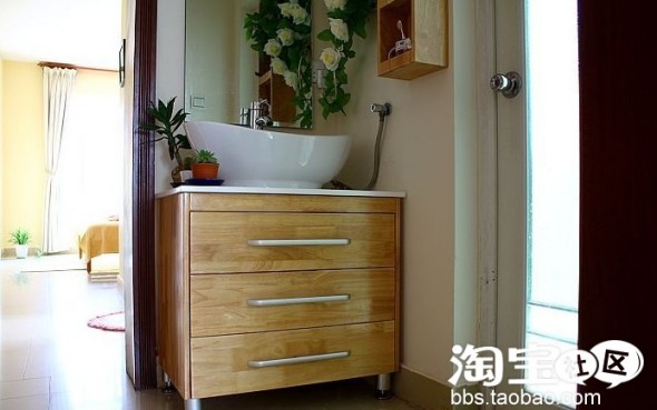 浴室柜,柜体是橡木实木,配一个竖的侧柜,一面镜子,本来镜子下边还有一个小小的托柜,觉得没必要,就撤了,这算是偶在淘宝上买的第一个“大件”了。