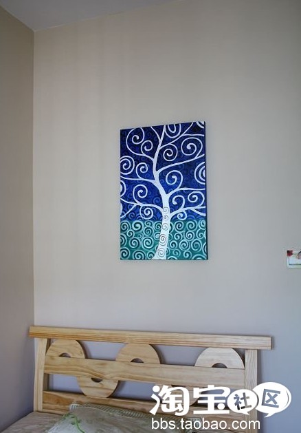 一款是“发财树”,挂书房,挂上去才发现,床头的造型和这画还蛮配的。