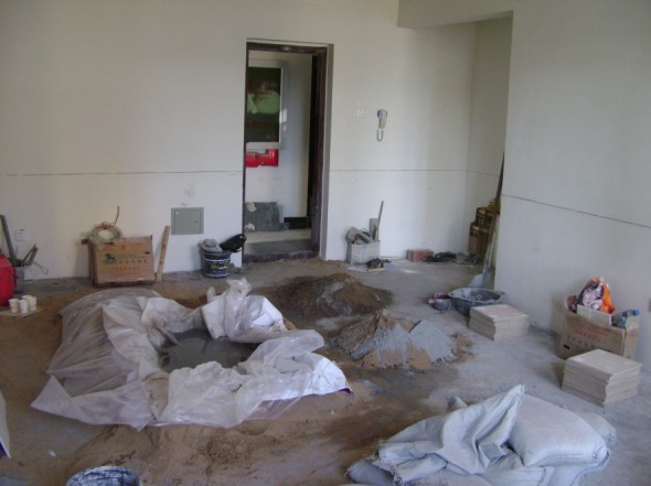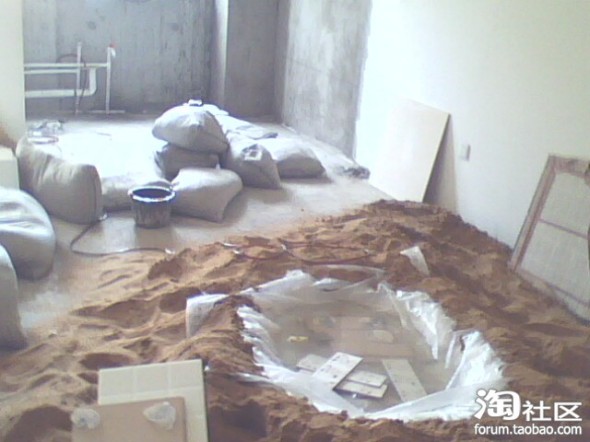 客厅和厨房原始的连接状态就是这样,这个用沙子做的水槽是我自己做的,泡的都是厨房的瓷砖。因为样品砖后面有胶块,泡掉了才好用,我干了一个下午,哎,为了省钱就得自己辛苦了。