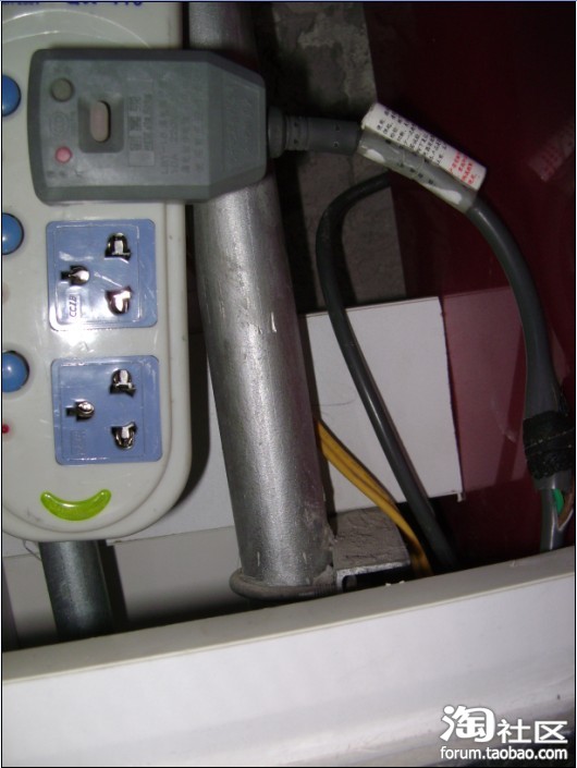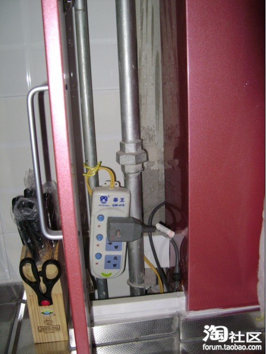 这个插座上面就是燃气热水器的电源,看到右下角的线了么?被截断了再重新接上的。因为是为了把热水器的电源线从柜门里面藏起来,可是这个插头是很特殊的,当初老公还说把它拆开,可是人家是三角形的螺丝拧上的,连螺丝刀都买不到。后来人家安装热水器的师父说千万别整坏了,不然都不给保修,把线剪断从燃气管的预留孔的缝里面穿过去然后再接上的。很不错的主意。