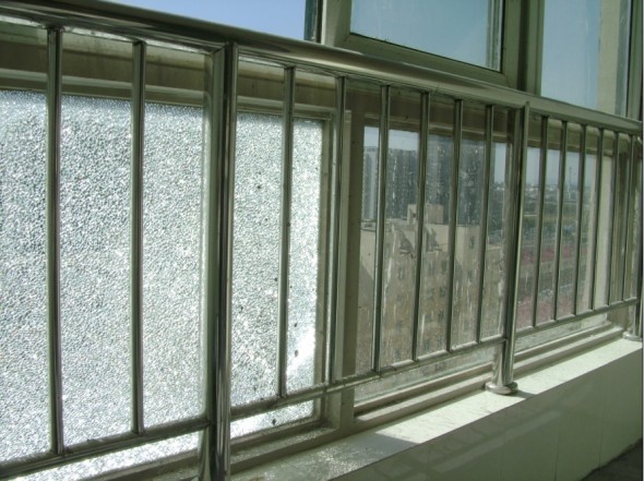钢化玻璃自曝的最大特点就是蝴蝶斑,碎了也不掉下去,否则很恐惧。