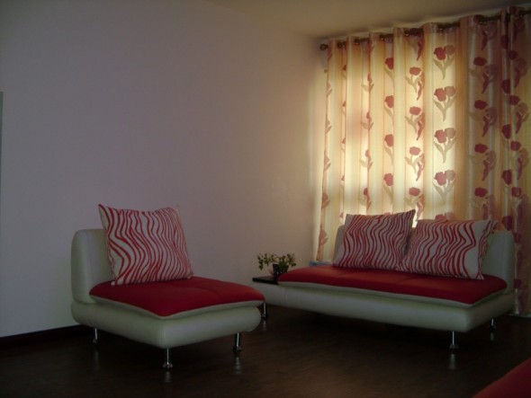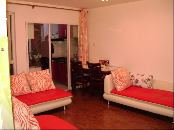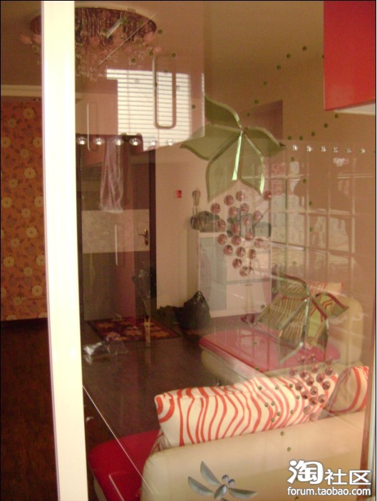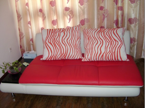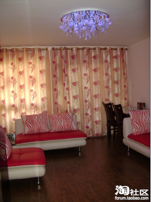 小沙发后面是原来的电视墙。沙发是真皮的,红色的都是牛皮,白色的是配皮,照样是香河家具城买的哈。