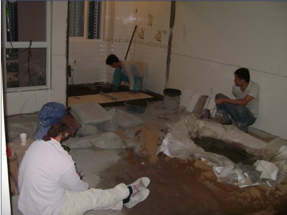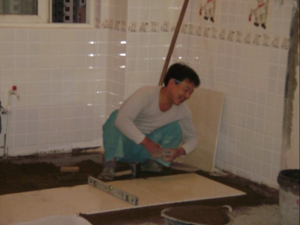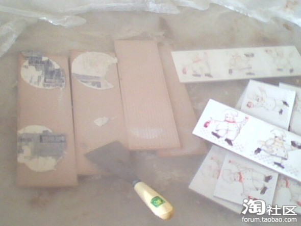 老郑师傅和小郑师傅在镶墙砖。我家的墙砖买的比较便宜,但是质量依然很好。是样板间的样品。卖场里样板间的瓷砖都是用胶粘上去的,比较容易拿下来。当时正好赶上处理,所以3块钱一块就买下了。淡蓝色和淡黄色两个颜色,经过考虑我决定混搭的镶嵌,而且老公凭借软磨硬泡的功夫把花片和腰线也要来了,省了不少银子。厨房的瓷砖因为很多要被柜子挡住,所以可以考虑露出来的地方买好的,漏不出来的地方买一般的,但是一定要算好面积。我算不好,索性就来了个混搭。老公自己改的电。就改了一个,实践证明改少了。