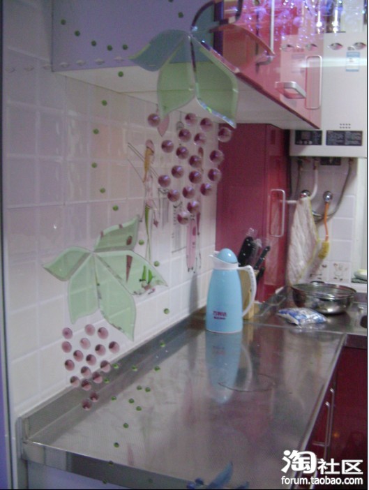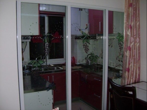 厨房的拉门,160一平米做的,上面是葡萄和蜻蜓。葡萄寓意人丁兴旺,也是希望家庭和睦,嘻嘻