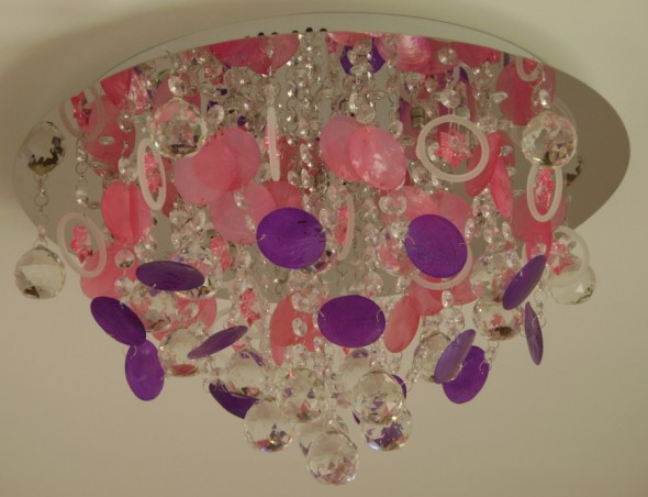 简单的吊顶,上面还有一条黄色的LED灯带,晚上很温馨,小射灯也是黄色的。粉红色的贝壳灯,风吹过的时候像风铃一样回响的。