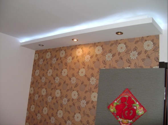 半成品是不是有点让人意外呀哈。吊顶是我出差的时候老公整的。本来想用这个墙做电视背景墙,直接买个电视挂墙上。现在看来有点不合适。不过还是首选。壁纸200一卷。