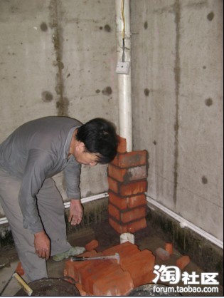 瓦匠老郑同志正在用红砖把下水管道包裹起来,浴霸的开关就要镶嵌在里面。现在可以看到已经改好暗管的水管。两根水管一冷一热。交房的时候厨房到卫生间的热水管是预埋好的,全部采用地暖所以没有外挂暖气也很省地方。