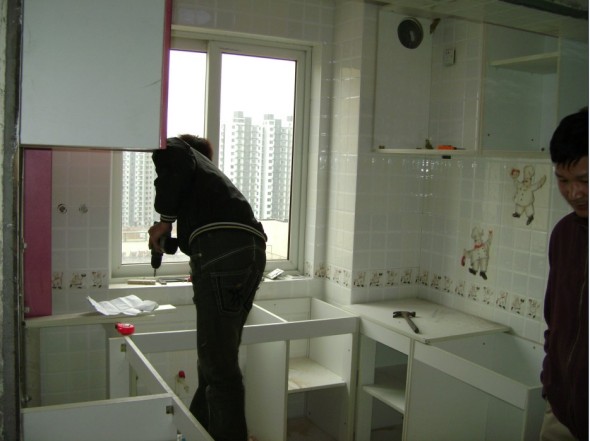 整体厨房进场施工了,等了一个月才来,都是这个进度。右边是老公在督导哈。干活的东北小伙很麻利。