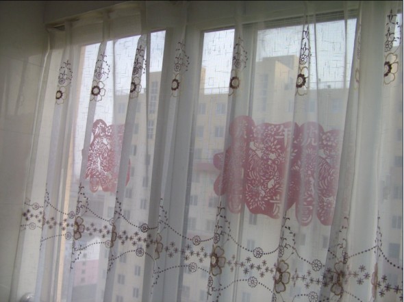 左边的窗帘。窗帘是双层的,外面是薄纱的,里面是一层布,淡黄色的