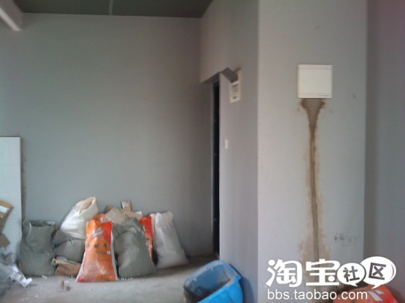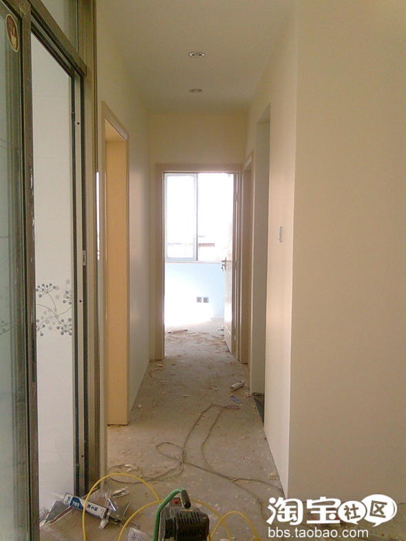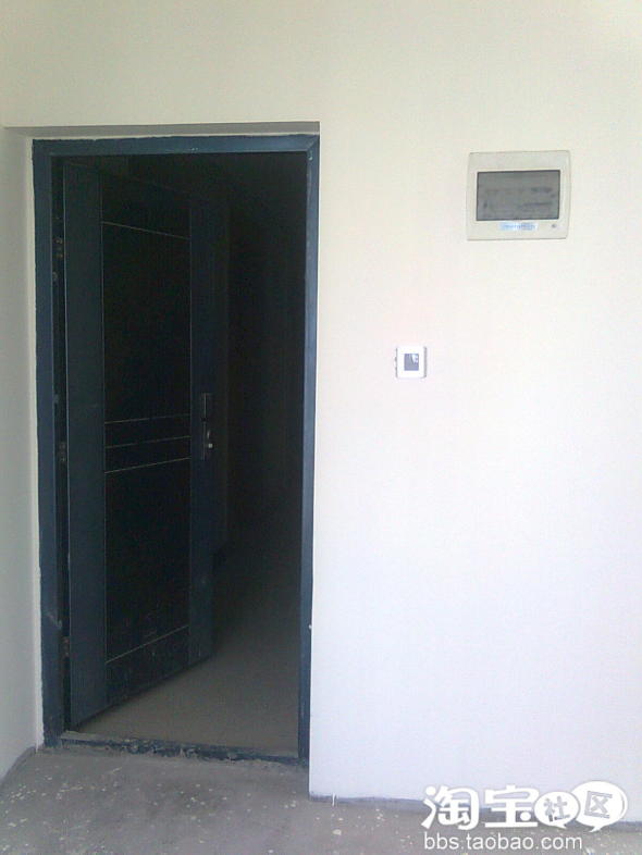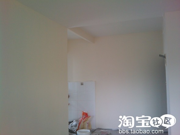 右边是分户门,墙上涂了外墙漆,是所谓的入户花厅,原本中间有道玻璃门,拆了,因为有外墙漆,所以滚漆前这里没刷腻子粉,怕以后掉漆,只是面漆要多刷一道