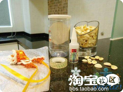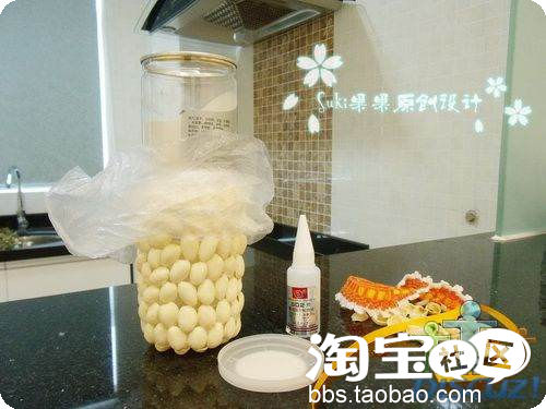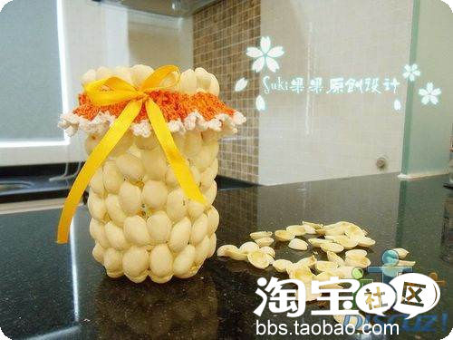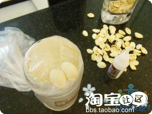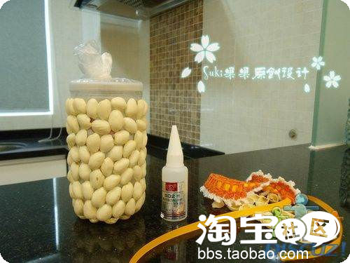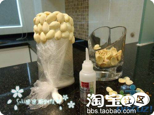 2 先从瓶底开始,选大小相近的果仁壳(这样成品才平衡喔)挨个拼好,在拼接处粘上胶水