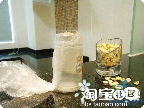 1 首先把保鲜袋套在瓶子上裹紧,用透明胶固定好