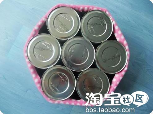 准备7个空奶粉罐,使用宽胶带绑在一起,成花的形状。注意先绑两个,然后将其他的围着绑,不然中间的那个就松了。
