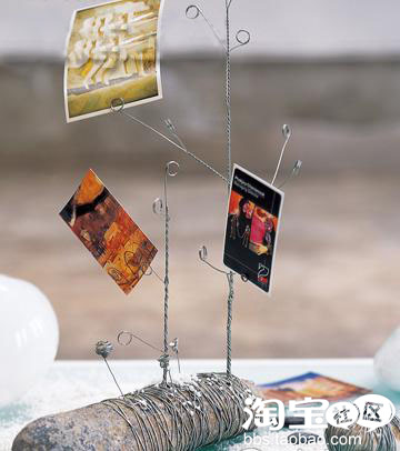 用几根铁丝拧在一起,不时地把枝杈留出,随意折出自己想要的形状。每个枝杈的末端要拿木棒缠出一个类似弹簧的夹子。最后再把树根固定在石头上,如果不想小树太孤单,再为小树做几个可爱的小蘑菇。