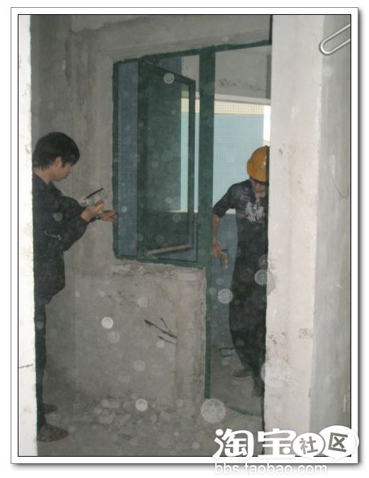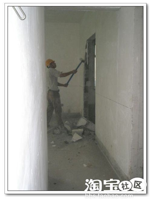 这是在砸主卧的卫生间,要把门往里移一下,一个是这样空间好用一些,然后是风水问题,师傅说洗手间门对着床不好,影响身体,广东人还是很讲究风水的,虽然我也不太注重这些玩意,可是还是听从了,觉得有道理!