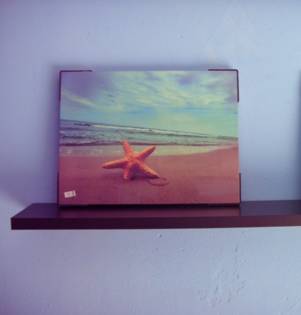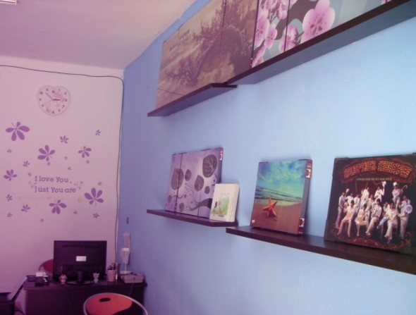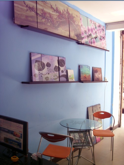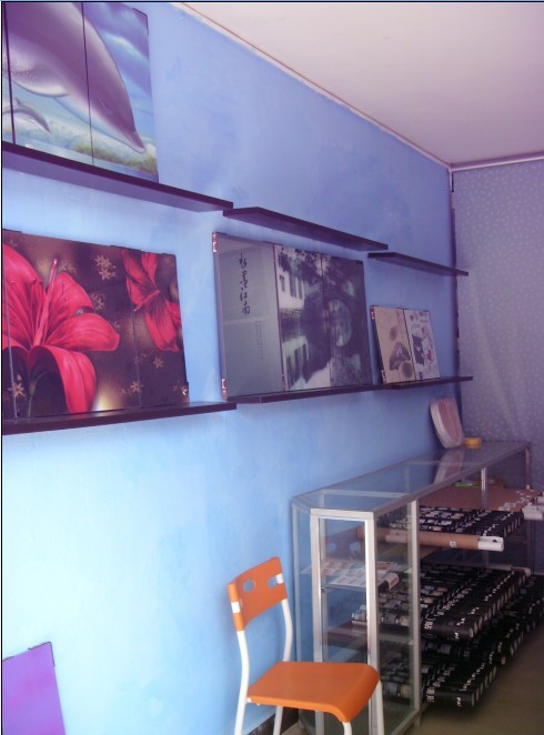 店铺的一侧,店铺不是很大,2边放画中间放了一个木格子,木格子和墙上的隔板是自己在淘宝上淘的,花了700块,货运过来以后还需要自己去组装,隔板也要自己在墙上打钻以后安装,整整话了我1天的时间去弄呢。