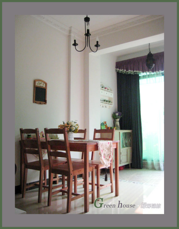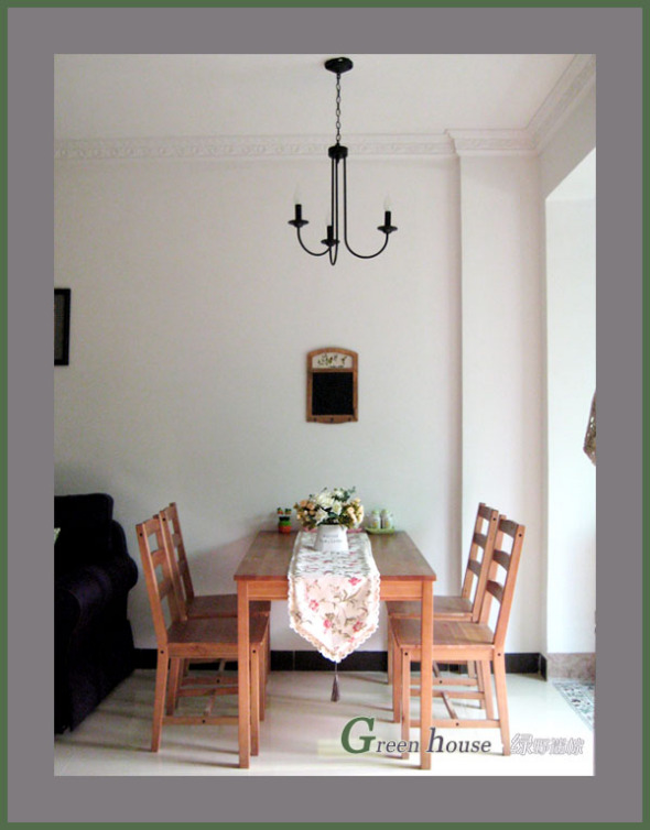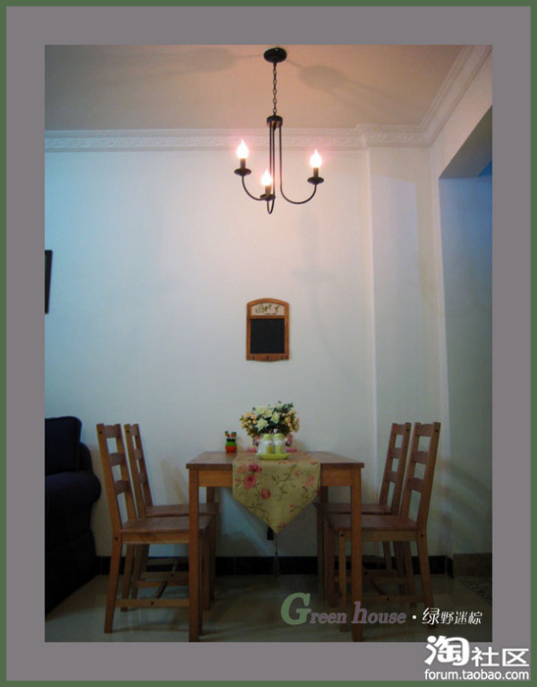 餐厅就在沙发旁边,地方小,没办法了!本来打算用自己店的纯白餐桌椅,但婆婆说怕脏,老公说很喜欢原木,所以就选择了宜家的一桌四椅,非常便宜,才799元,加上运费才800多!不过质量就一般般了!还好原木风格挺浓厚的,还算是可以接受吧!早知道还是要自己的一桌四椅:http://item.taobao.com/auction/item_detail-0db2-4e52f200d980db57eb8243b9740833ed.htm