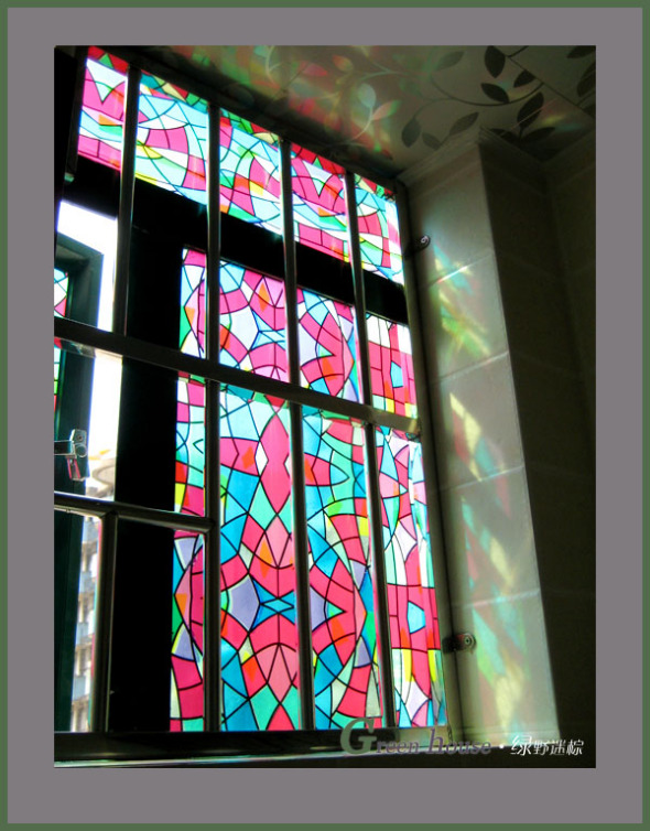 洗手间的窗,我贴了彩色玻璃纸,有点像琉璃玻璃的感觉,玻璃纸很便宜哦,是在本地一家杂货店买的,才4元,超棒的!