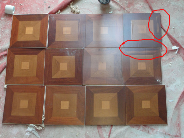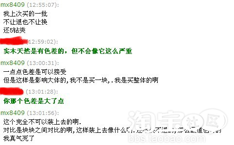 而且我还问了其他的卖家,复合地板的色差性很小的,因为大家知道的,实木是天然的是存在色差,可是这个不是说是色差的问题.购买的当时,卖家也跟我说跟实物的图片有出入的.我说没关系的,每一快查不多问题是不大的.现在这12块对比,没有相同的2块.我非常气愤....