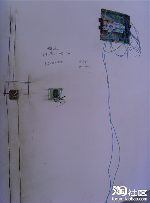 餐厅的背景墙抽上出来的线和开好的槽,冒似有些一片狼藉。这边顺便说下,其实你无需担心装修时很多东西找不到,光一天呆在小区里我就收到了N多的名片,运送水泥黄沙的,搬运的,打孔的,诸如此类。品种凡多。瞧,给了名片给我还不够,非得把联系方式给写到墙上了。呵呵。