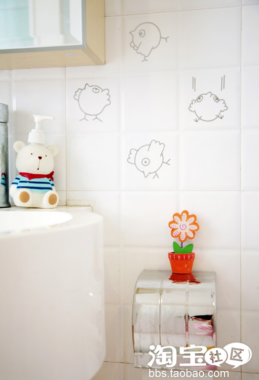 5、卫生间:几个涂鸦式的瓷砖花砖,妆点了卫生间一角,让素白的空间增添了几分变化;