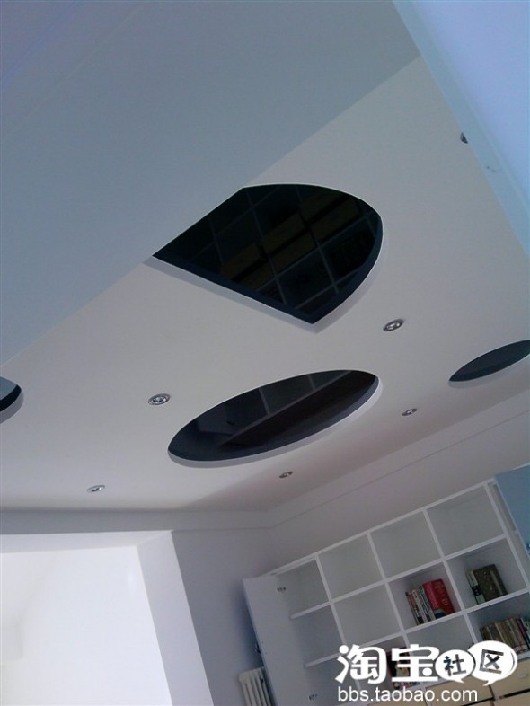 还有一个地方,个人认为比较有特色。由于阁楼上的有些地方时尖屋顶的,有一定的空间,如果做天花板把它挡在里面比较可惜了,所以我和老公决定把上面再隔一层,可以放些杂物在上面,结果做出来的效果还真不错呢,像是又多了一层楼,上面层高也有160公分,我在上面能直起身子来。而且天花板我们用黑玻璃做的造型,还起了个很有诗意的名字,叫“众星捧月”,呵呵。