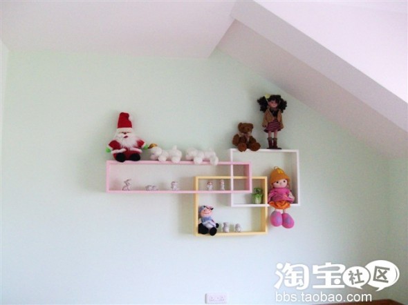 儿童房,没有买床,木匠用木料做了榻榻米,我是想着将来孩子在这里玩,也不怕跌倒磕碰的。墙壁上用剩下的木料做了几个小造型,上面放着我平时收集的娃娃,还是童趣味十足的。