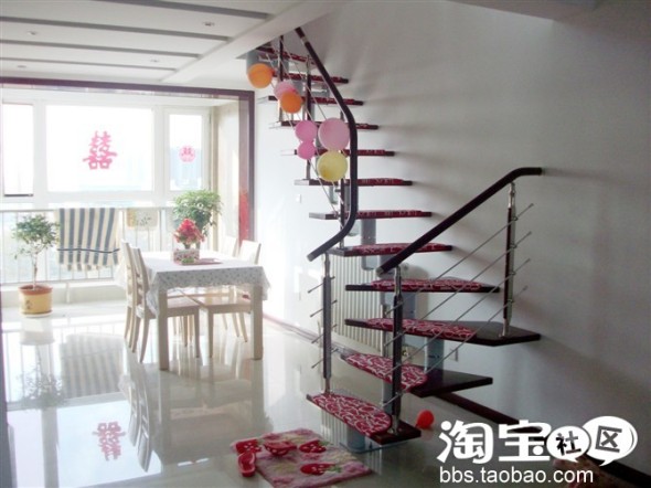 楼梯选的是钢木结合的,看着比较现代。开始的时候,比较了一下实木的和钢木结合的,发现实木的不是很适合年轻人,所以最后还是选了钢木结合的,看起来,比较简洁大方。