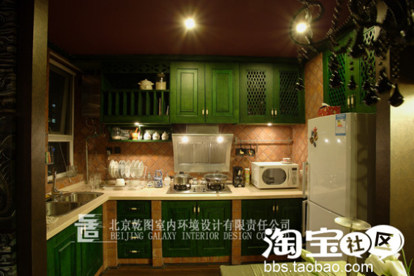 9、厨房:一面的厨柜虽然简单,但是功能是非常齐全的,风格也是欧风盎然;