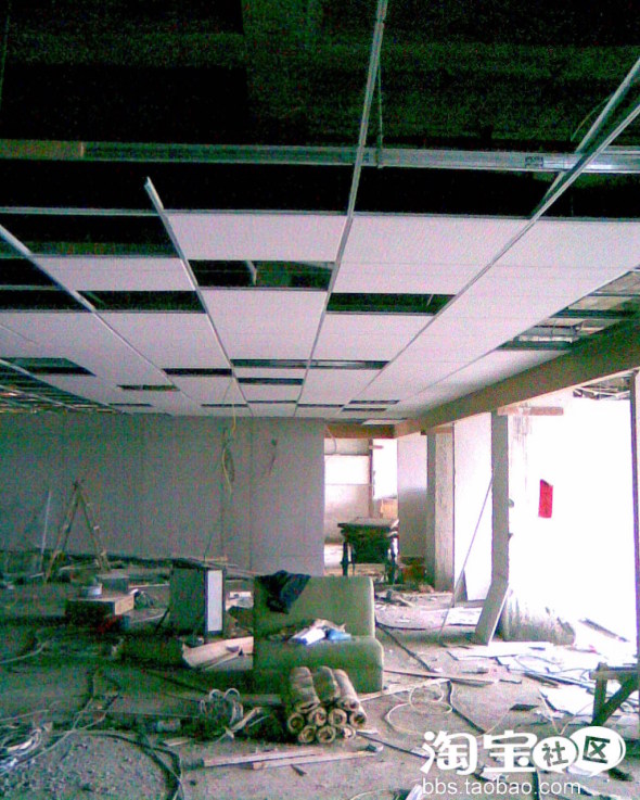 在进行场内装修的过程中我们要妥善安排材料的堆放.箱里的都是天花板.