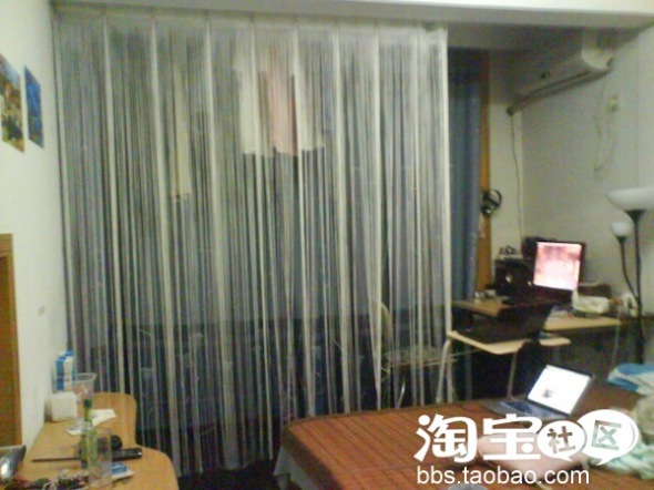 老婆买的线帘,点睛之笔,杭州這邊的房子大多把陽台包進主臥了,下雨天晾衣服的話,屋裡黑壓壓的一片,看過去都沈悶,但是把線帘一拉上就好很多了(请再次无视杂乱的床……):