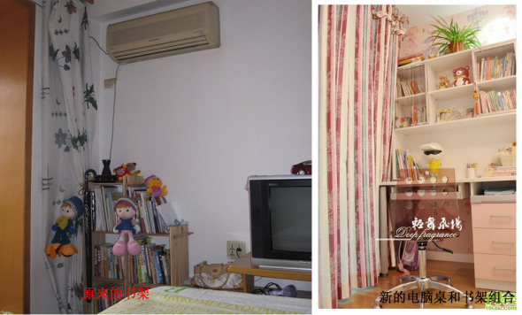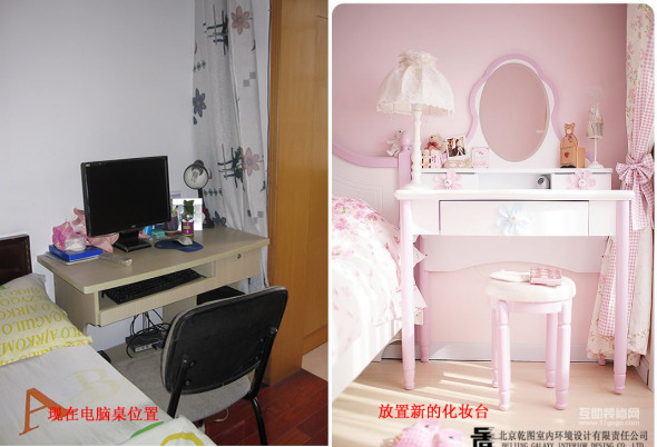 原来的化妆台很矮,换成这样的粉红系列的化妆台虽小,但能够让自己每天都打扮打扮下哦,同时能在很大程度上体现出卧室的品位....。