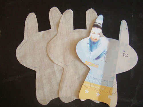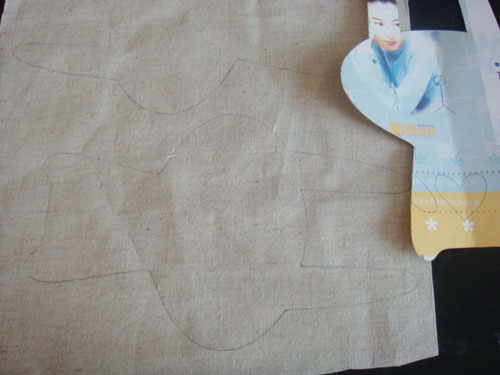 1.首先类~先要剪下纸型,然后画到麻布上面。我平时一般都是用铅笔的,因为铅笔容易清洗嘛~不过这次我顺手用圆珠笔画的~但是最最专业的就是用水消笔啊。我会考虑以后进一些水消笔的~