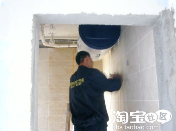 这是阿里斯顿热水器的安装人员,正在现场安装,由于集成吊顶要半包热水器,所以这个需要最先安装。
