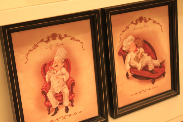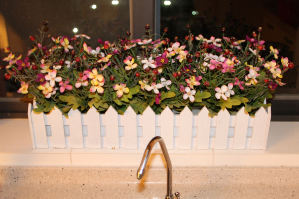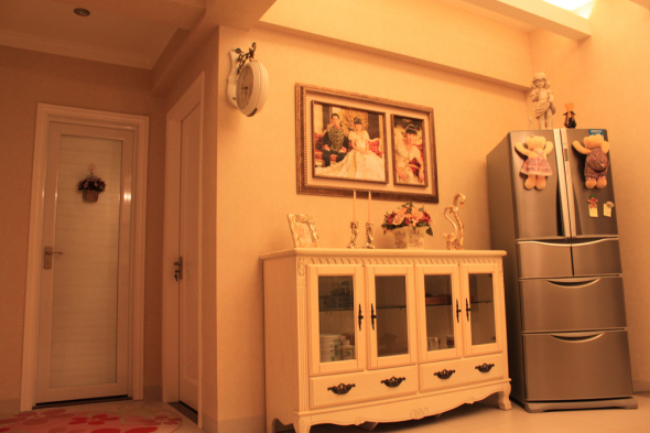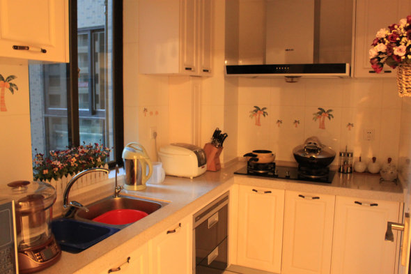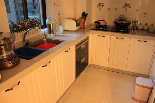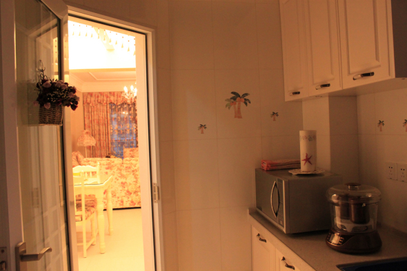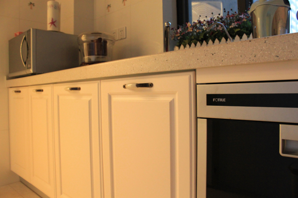厨房让我比较闹心,话说谁家的欧式橱柜用白色墙砖呢?因为当初也不懂,一切听设计师的,而且一个礼拜才去房子里看一次,结果墙砖贴上了才发现不对劲,我本想砸掉重来,老公说太费时费银子,我屈服了。可是每次一想到这个事心里就堵的慌,后悔啊我,不该屈服的。所以后来我拼命装饰它