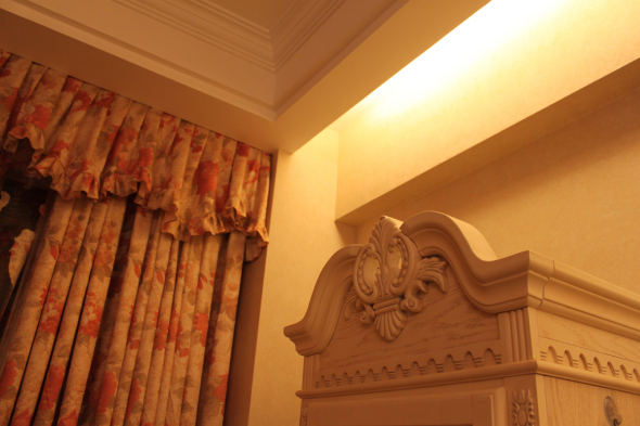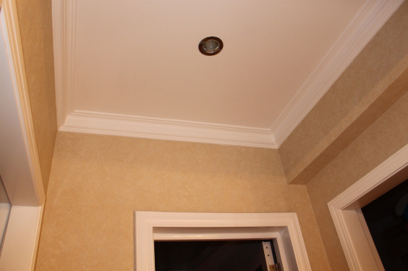 天花板上用的是石膏条,门边是用实木包起来的,两者看起来似乎一样,但下次能用石膏条就用石膏条,既便宜又不怕变形