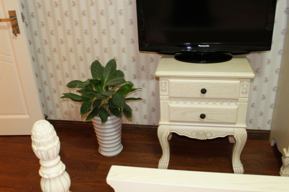 不想在墙壁上凿洞,怕损坏墙纸,但又摆不下大一点的电视柜,所以买了个小桌子当电视柜来用