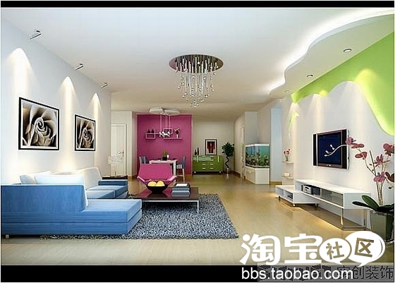 沙发背景墙上壁画是客厅的亮点,用小射灯打造出唯美的梦幻,暗褐色的玫瑰没有红的奔放,却更带幽雅!琉璃的水晶灯带着高贵,电视背景墙的嫩绿底衬托出客厅的俏皮。