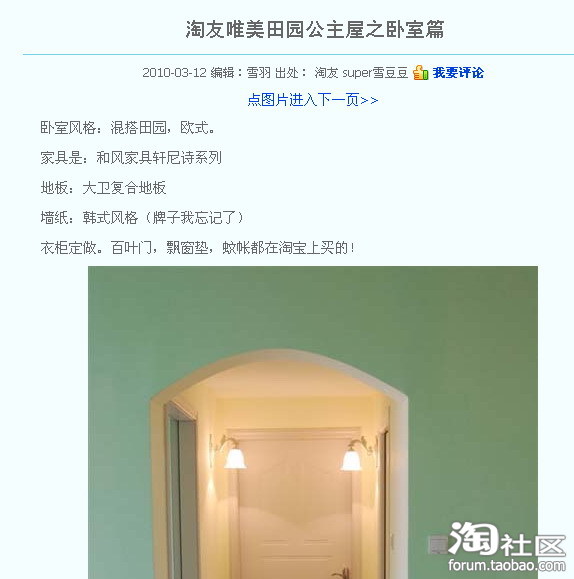 漂亮老师雪豆豆网购精心打造田园梦幻小窝。已在淘宝网,淘宝画报,搜狐网,人人网,互助装修网上闪亮登场!(排名不分先后!呵呵)很多我自己都不知道!是朋友们告诉我的!谢谢大家,厚爱!