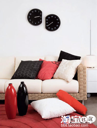 采用较为单纯的搭配手法,利用黑、白、红色的鲜明对比,将客厅的层次拉伸开,用三种最分明的色彩形成视觉上的强烈对比。选择更加纯粹的色彩,能增加视觉的冲击力,也营造出了时尚新锐的潮流感。靠包的色彩与地毯、装饰品、挂钟、墙面相呼应,使得原本单纯的装饰手法显得并不简单,而且还活力十足。这种搭配手法最适合简洁风格的小客厅,鲜明的色彩对比能将重点转移到装饰上,而弱化原本过小的客厅面积。同时,那些有设计感的饰品无须过量装点,一两件便可成为经典。