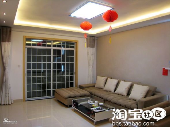 灯光是所有家装工程中,最便宜也是最有效果的。由于主灯照明没有层次,所以采用间接照明,中间做天花板,内藏灯带及嵌灯,再搭配立灯及桌灯,整个空间就变得很有气氛,也增加了家具的质感。地面采用大面地毯,墙面则用壁画装饰,就能充分显现出客厅的气势,虽然花钱不多,效果倒是不错。