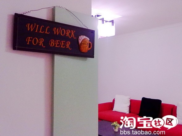 吧台侧壁悬挂一个北欧风格招牌,老公的最爱。从吧台处看到的是我们的卧室,红色沙发,后悔没买成蓝色调的,要不然画好手绘墙就可以做成地中海风格啦~