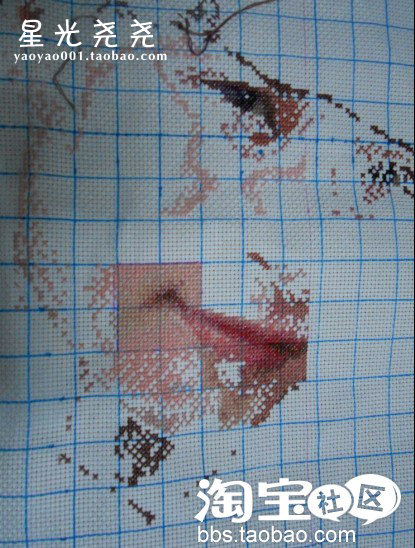 我干活向来有点急性子,绣这个也是三心两意啊!本想按着格子数,从左往右,从上往下的绣,可是绣了半天都是背景就没兴趣了,于是我转到绣眼睛/嘴巴的位置了