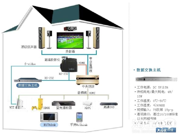 控制方面,DVD、高清DVD、HDPC、蓝光播放器、X-BOX和WII都是用红外控制;中央功放和投影仪可由数据交换主机进行控制。