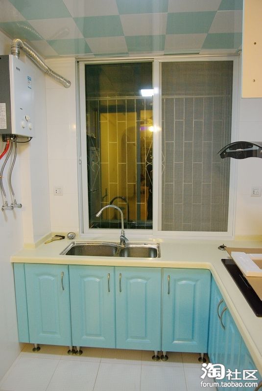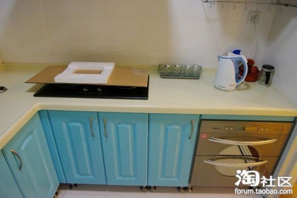 哄哄!装好后的厨房一角,餐桌上很乱哦,都是地中海的装饰品哦!中间用玻璃门隔开餐厅和厨房,也是油烟分离,大家注意看我们放冰箱处,是挖了一个冰箱的位置放进去的,因为厨房有点小,想了好久,都不知道怎么放,后来请了我们一位当室内设计师的朋友帮我们想的法子,真的是非常的巧妙哦!大家一定会想那么凸出去的部位怎么办?嘿嘿,后面会说到哦!话说我们这个帅哥朋友真的帮了我们很大一个忙,给我们的地中海提供了很多有效的意见哦!