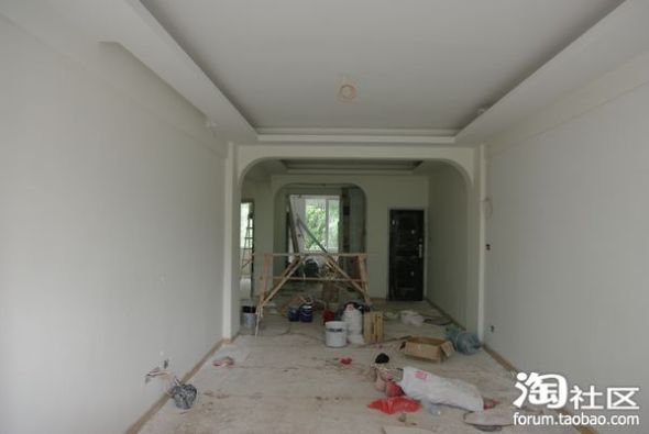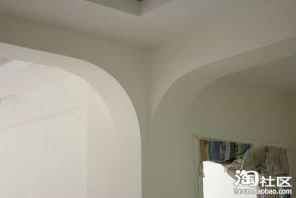 啊哈!这个就有点像洗完脸,素颜的姑娘啦,多少看出点眉目啦,大家注意看了哦,地中海标志之一、拱形,我们在客厅、厨房和走廊处都用了这样的微拱,马上就闻到地中海的味道了吧,哇哈哈!