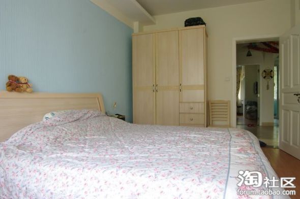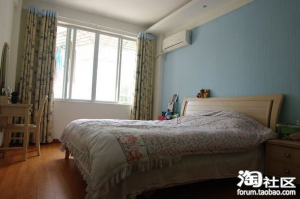 这是站在次卧门口拍的室内,里面的家具刚刚装好哦!地板用的是复合地板,因为海南比较潮湿,不能用实木的啦,家里的家具都是这个系列的哦!颜色很正,是在外面家具城看到,到网上淘的,真正的地中海家具是非常的贵的呀,动不动就上万的!妈妈咪呀!窗帘是蓝色玫瑰花很浪漫的感觉!空调是松下的!